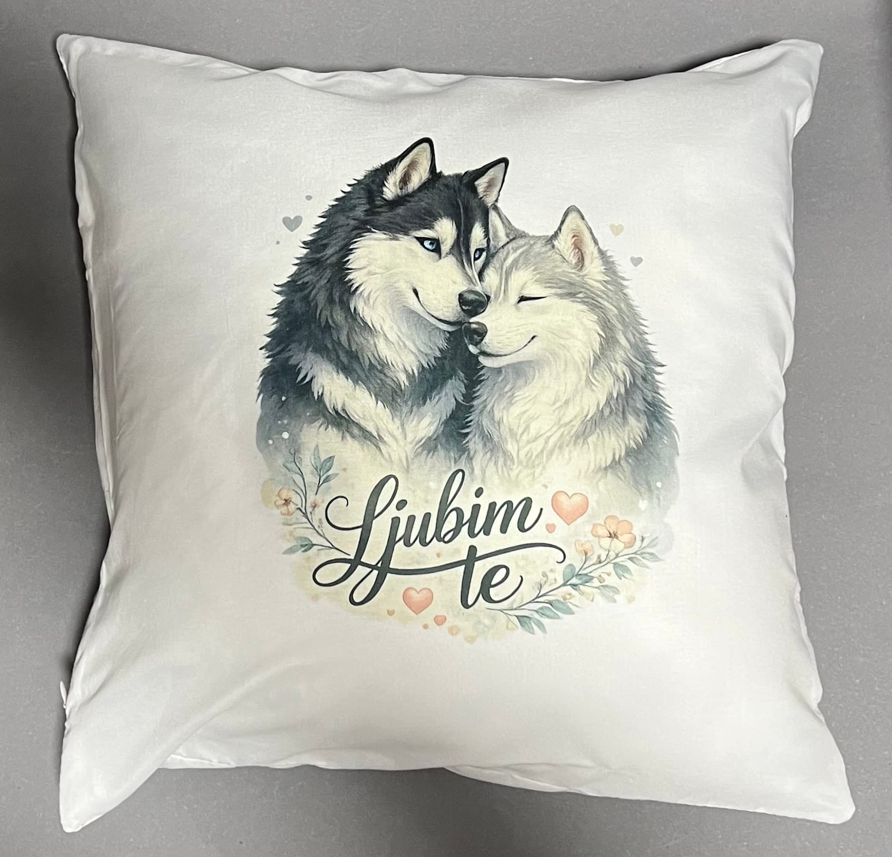 Elegantna in čustveno bogata okrasna blazina z motivom Huskyjev, ki simbolizirata zvestobo, povezanost in brezpogojno ljubezen. Nežna ilustracija v kombinaciji z napisom »Ljubim te« ter cvetličnimi in srčnimi detajli ustvari topel, umirjen in romantičen videz, ki polepša vsak prostor.