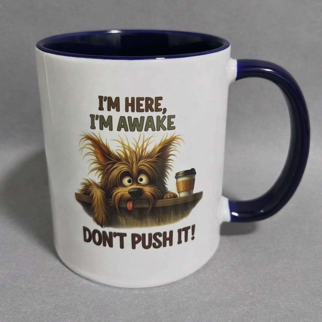 Popestri svoje jutro s to simpatično skodelico, ki pove vse. Prikupen, zaspan kuža s kavo in napisom “I’m here, I’m awake – don’t push it!” bo nasmejal vsakega, ki še ni povsem pripravljen na pogovor.