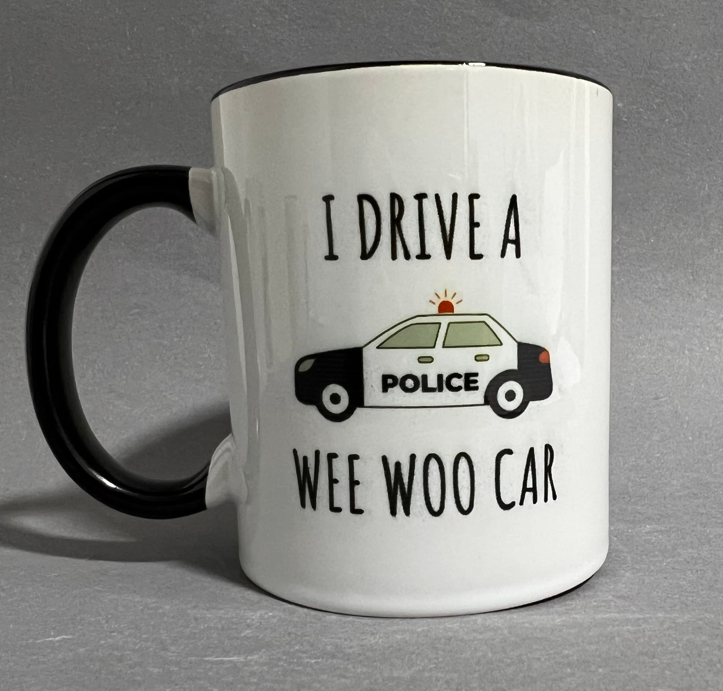 Z napisom “I drive a wee woo car” in prikupno sliko policijskega avta bo ta skodelica vsakemu pričarala nasmeh — naj bo v službi, doma ali na poti.